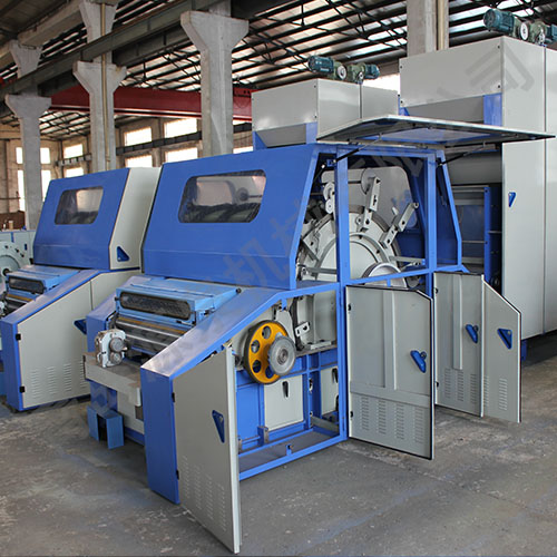 本機(jī)主要適用于山羊絨、兔絨、牦牛絨、蠶絲、化纖等散纖維,適紡纖維長度為16-80mm。將電子稱重喂毛機(jī)均勻送來的纖維層進(jìn)行開松和梳理,使所有呈卷曲,塊狀的纖維理成基本伸直的單纖維狀態(tài),后經(jīng)剝網(wǎng)圈條供后道工序使用。